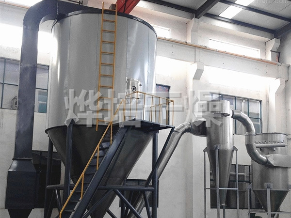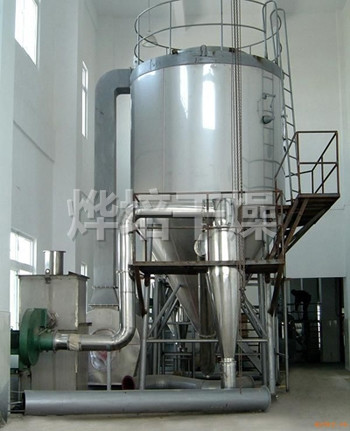 空气经过滤和加热,进入干燥器顶部空气分配器,热空气呈螺旋状均匀地进入干燥室。料液经塔体顶部的高速离心雾化器,(旋转)喷雾成极细微的雾状液珠,与热空气并流接触在极短的时间内可干燥为成品。成品连续地由干燥塔底部和旋风分离器中输出,废气由风机排空。
