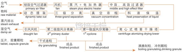 中药浸膏高速离心喷雾装置是离心式喷雾干燥技术在特定物料干燥中的应用,也是利用高速离心式雾化器使物料分散成雾状,与热空气充分接触,完成瞬间干燥,形成粉状成品的干燥装置。