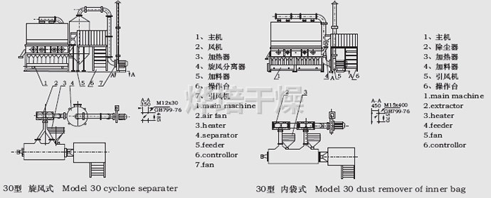作台组成,由于干燥物料的性质不同,配套除尘设备时,可按需要考虑,可同时选择旋风分离器、布袋除尘器,也可选择其中一种,一般来说比重较大的如冲剂及颗粒料干燥只需选择旋风分离器,比重较轻的小颗粒状和粉状物料需配套布袋除尘器,并备有气力送料装置及皮带输送机供选择。