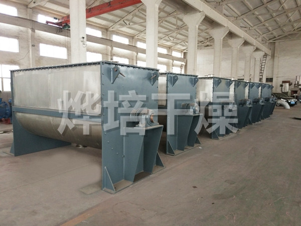 该机型由容器、螺旋搅拌叶片和传动部件组成:螺旋叶片一般做成双层或三层,外层螺旋将物料从两侧向中央汇集,内层螺旋将物料从中央两侧输送,形成对流混合。