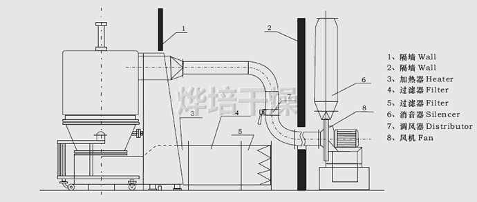 空气经加热净化后,由引风机从下部导入,穿过料斗的孔网板。在工作室内,经搅拌和负压作用形成流态化,水份快速蒸发后随着排气带走,物料快速干燥。